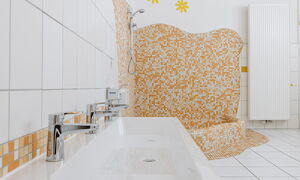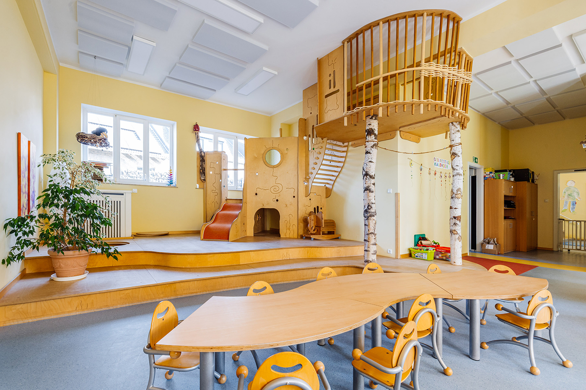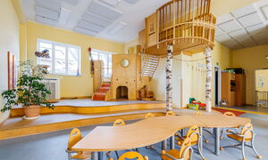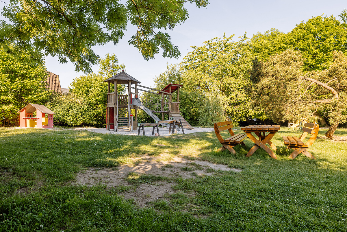 Das für eine Kita ungewöhnliche Gebäude und sein großer, naturnaher Garten mit dem alten Baumbestand haben Charme. Die große Holzempore in einem Gruppenraum lädt schon die Kleinsten zum Spielen und Klettern ein. Auch im Außengelände ist Platz für Bewegung und Naturerfahrung.