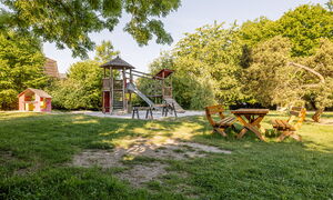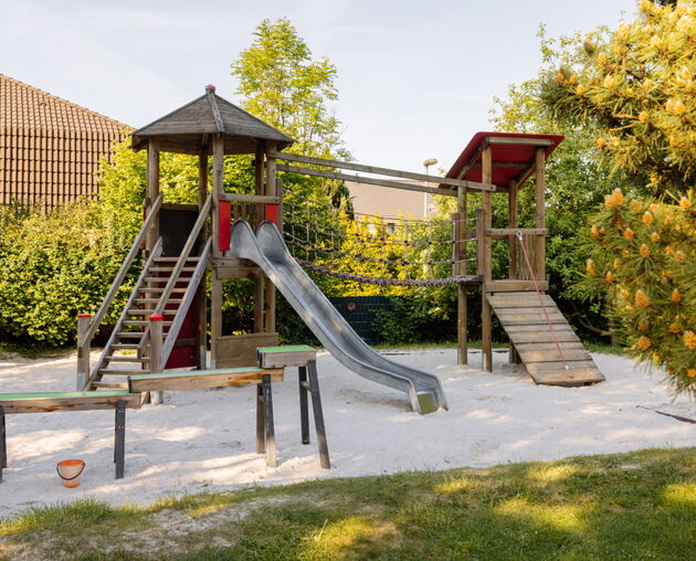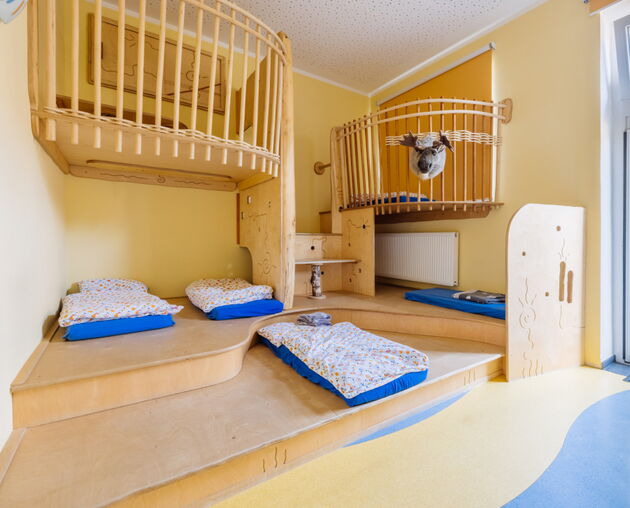 Das für eine Kita ungewöhnliche Gebäude und sein großer, naturnaher Garten mit dem alten Baumbestand haben Charme. Die große Holzempore in einem Gruppenraum lädt schon die Kleinsten zum Spielen und Klettern ein. Auch im Außengelände ist Platz für Bewegung und Naturerfahrung.
