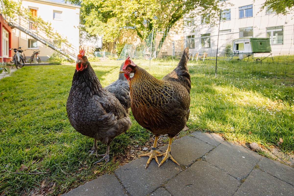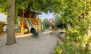 Ein besonderes Merkmal unserer Kita ist das naturnahe Außengelände. Es bietet den Kindern vielfältige Möglichkeiten zum Spielen, Erkunden und Lernen bieten. Hier können sie mit Wasser experimentieren, über Felsen klettern, sich in Sträuchern verstecken oder auf der Wiese ausruhen. Der Kontakt zur Natur fördert nicht nur die motorische Entwicklung, sondern auch die Kreativität und Selbstständigkeit. Ergänzt wird unser Konzept durch die Haltung eigener Hühner sowie regelmäßige Waldausflüge für die älteren Kinder, bei denen sie die Natur hautnah erleben können.
