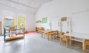 Wir arbeiten nach einem offenen Konzept, das unser Haus in verschiedene Funktionsbereiche gliedert. Hier können die Kinder in der großen Bewegungshalle aktiv sein, im Atelier ihrer Kreativität freien Lauf lassen oder im Bauwagen hämmern und sägen. Zudem bieten das Spielzimmer und das Nest altersgerechte Schwerpunkte. Im Außengelände gibt es nicht nur zahlreiche Spielmöglichkeiten, sondern auch die Gelegenheit, Tee und andere Nutzpflanzen in einem Hochbeet anzubauen. Das offene Konzept basiert darauf, den Kindern mehr Entscheidungsfreiheit und individuelle Entfaltungsmöglichkeiten zu bieten. Anstatt feste Gruppenstrukturen, können die Kinder ihre Aktivitäten selbst wählen und frei entscheiden.