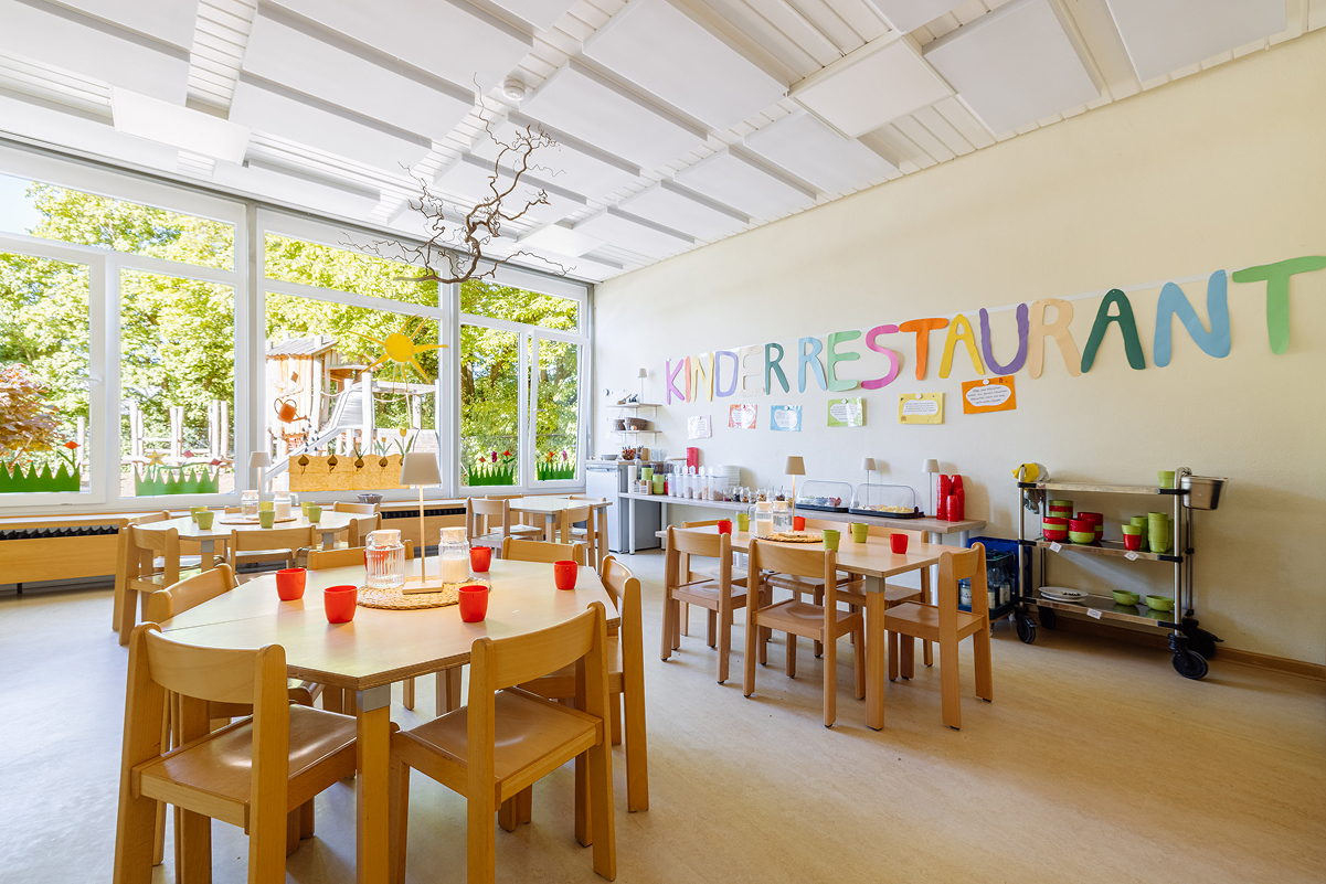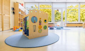 Beim Betreten unserer Kita gelangen Sie durch den Haupteingang in den Anbau, wo unser gemütliches Elterncafé zum Verweilen einlädt. Hier können Eltern in angenehmer Atmosphäre Kaffee oder Tee genießen und sich austauschen. Ein besonderes Highlight unseres Hauses ist der vielseitig nutzbare Mehrzweckraum. Dieser dient als Bewegungsraum, Veranstaltungsort für gemeinsame Feste, Wortgottesdienste sowie als Treffpunkt für unsere Eltern-Kind-Aktivitäten und die Krabbelgruppe "Griffbereit".